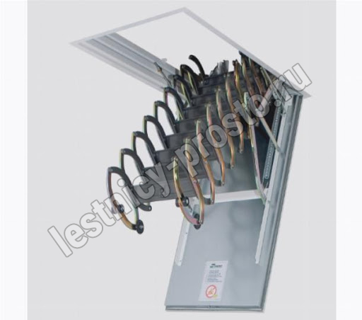 Крышка лестницы представляет собой многослойную конструкцию - деревянная рама, внутри которой находится пенопласт. Внутренняя часть крышки покрыта оцинкованной жестью, наружная часть белой эмалью и защитной пленкой. Толщина крышки 60 мм. Все соединяющие части изготовлены из твердого материала и имеют оцинкованное покрытие. Короб металлический высотой 140 мм., по периметру проходит уплотнитель. Ступени лестницы изготовлены из анодированной стали и покрыты порошковой краской, поверхность имеет антискользящие насечки и выдерживают нагрузку 150 кг.