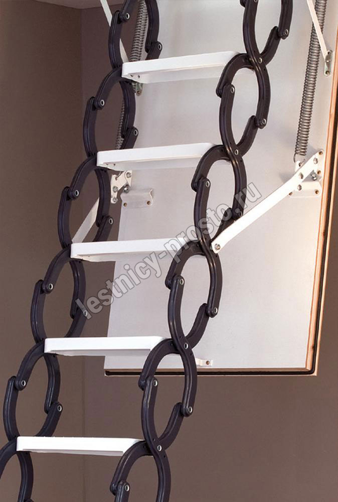 Ножничная лестница ELEGANCE износоустойчива, оснащена надежными металлическими защелками.