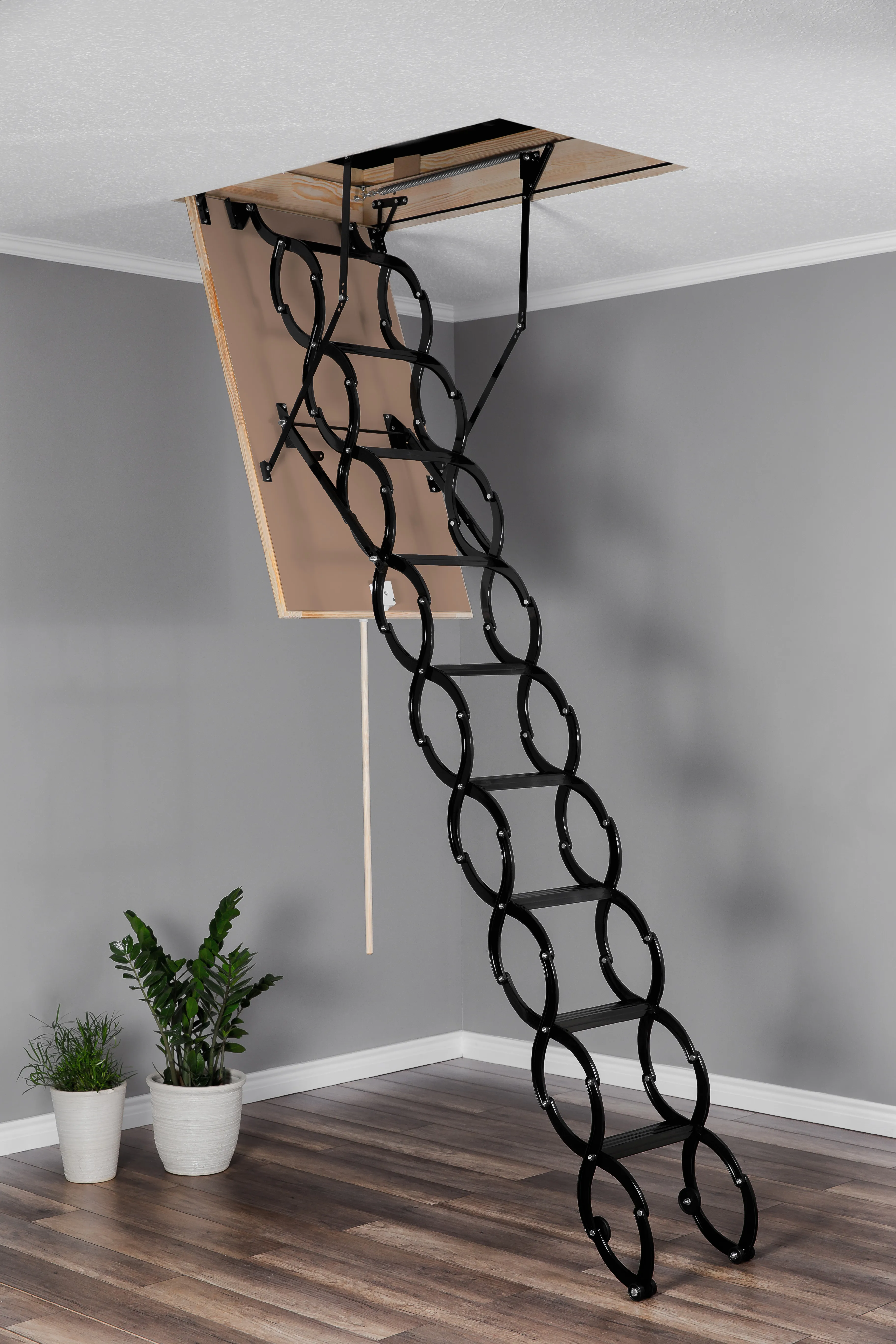Лестница складная трёхсекционная, изготовлена из сосны. Термоизоляционная крышка типа "сэндвич" утеплена пенопластом, облицована с двух сторон ДСП белого цвета. Короб люка с однослойным уплотнителем. Все металлические элементы лестницы покрыты порошковой краской, ступени лестницы имеют антискользящие насечки и закреплены в столярное соединение «ласточкин хвост», что позволяет выдерживать нагрузку до 150 кг. Деревянный стержень для открывания лестницы в комплекте.