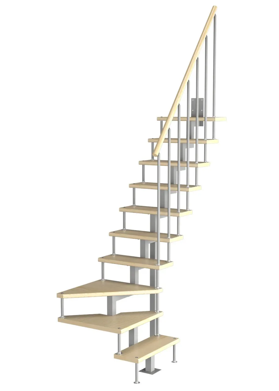 Базовый комплект включает в себя деревянные элементы лестницы и ограждения без какого-либо покрытия. Стильная сверхмалогабаритная лесенка, она выручит в таких помещениях, где установка других лестниц проблематична из-за нехватки пространства.