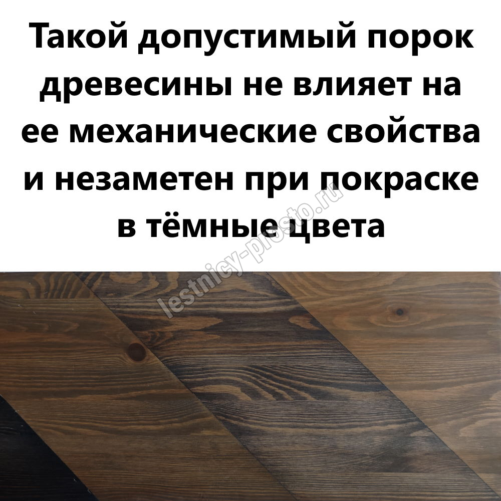 Для изготовления лестницы под покраску используется сосна с небольшими изменениями цвета - синевой, такой допустимый порок древесины существенно не влияет на ее механические свойства и практически незаметен при покраске в тёмные цвета.