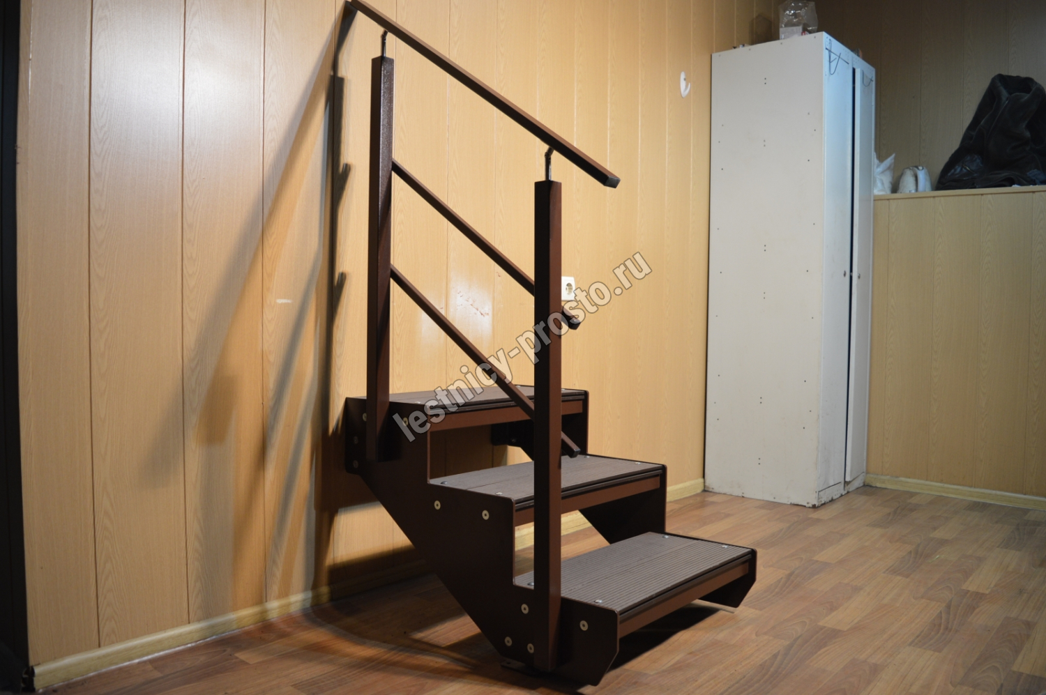 Ступени лестницы состоят из металлической рамки, обеспечивающей необходимую прочность, и покрытия из террасной доски ДПК (древесно-полимерный композит). Ступени не боятся воды и мороза, не теряют со временем свой внешний вид и не требуют ухода.