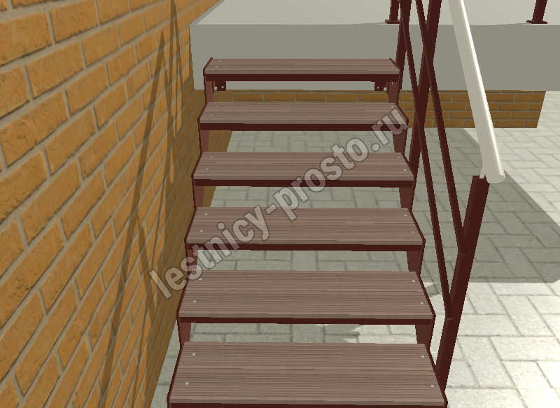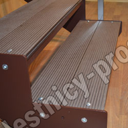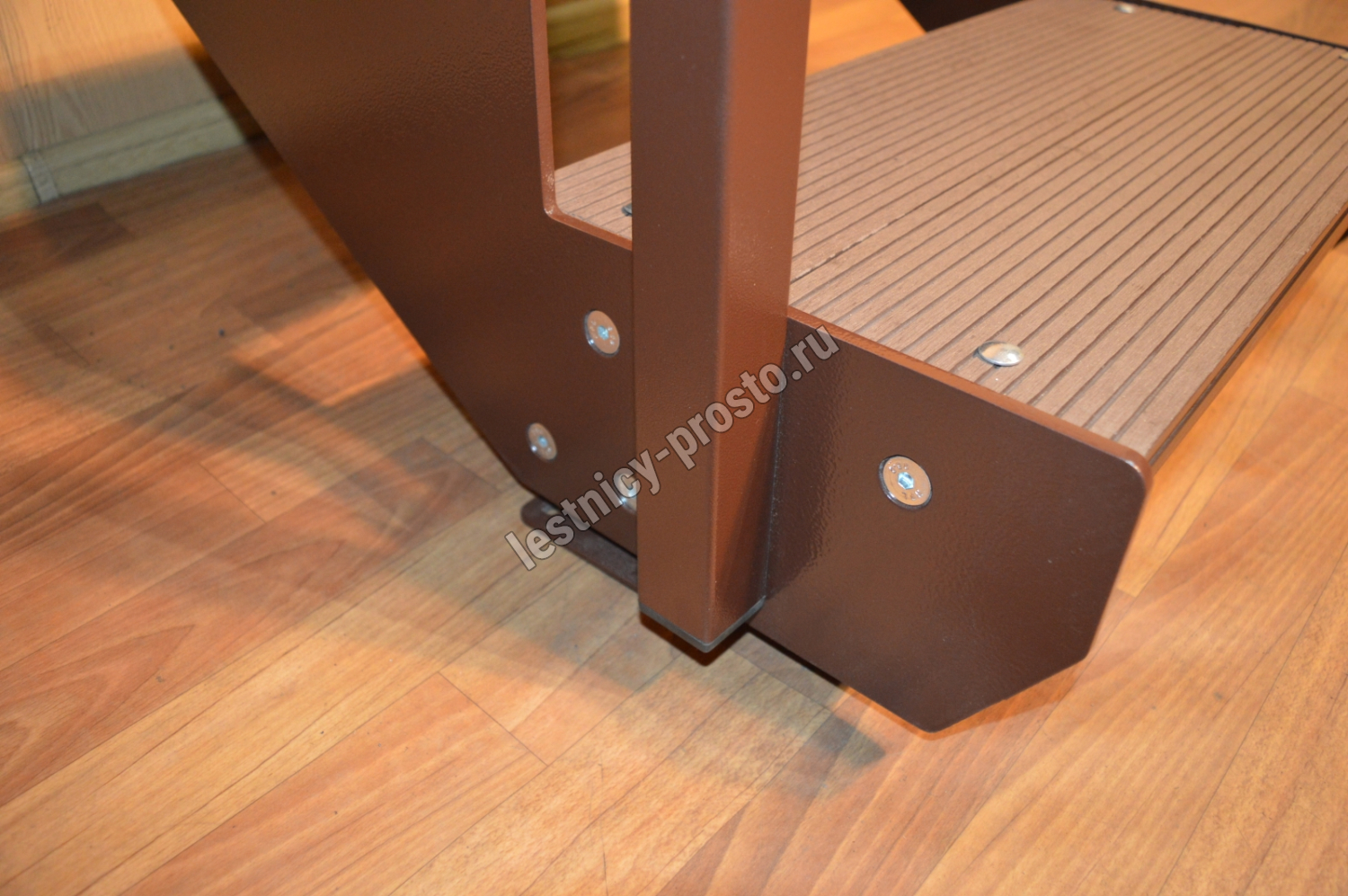 Покрытие порошковое, очень прочное и долговечное. Все детали каркаса крепятся с помощью болтов, благодаря чему Вы можете собрать каркас самостоятельно без применения сварки. В зависимости от ширины лестницы, каркас состоит из двух (ширина до 1 метра) или трех (ширина до 2 метров) опорных балок (тетив). Ступени лестницы состоят из металлической рамки, обеспечивающей необходимую прочность, и покрытия из террасной доски ДПК (древесно-полимерный композит). Ступени не боятся воды и мороза, не теряют со временем свой внешний вид и не требуют ухода. Нержавеющая сталь, которую мы используем для ограждений на улице - неприхотлива в обслуживании, выглядит стильно и прекрасно выдерживает капризы погоды