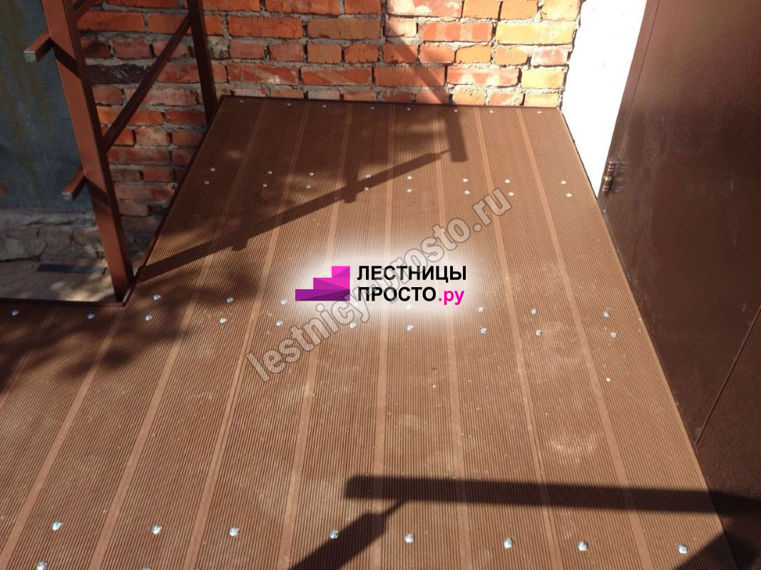 Ступени лестницы состоят из металлической рамки, обеспечивающей необходимую прочность, и покрытия из террасной доски ДПК (древесно-полимерный композит). Ступени не боятся воды и мороза, не теряют со временем свой внешний вид и не требуют ухода.
