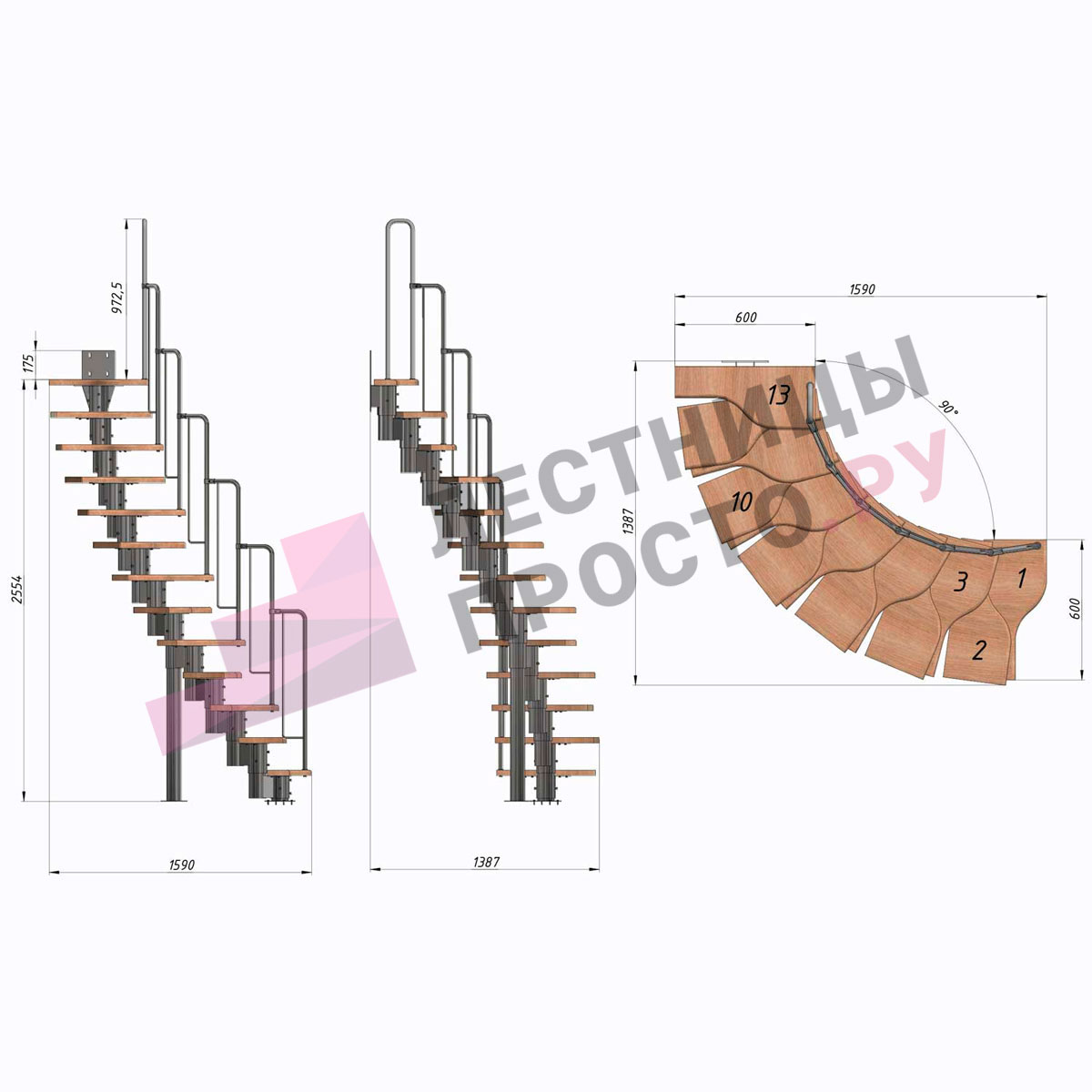 | Лестница Prosto Urban Grey г-образная гусиный шаг 600 мм, h216-312 см (12 ступеней) |