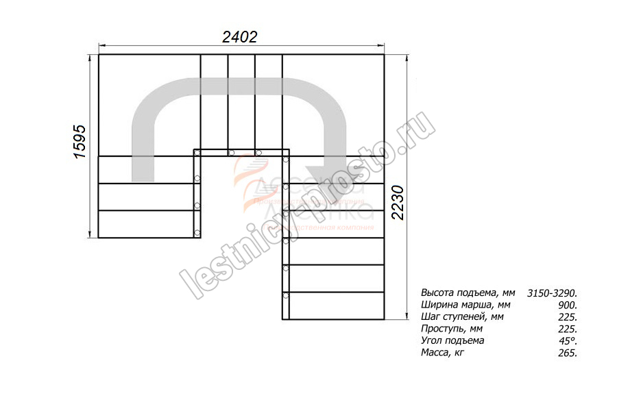Модульная лестница Комфорт 225 3150-3290, Белый, Сосна, Нержавеющая сталь