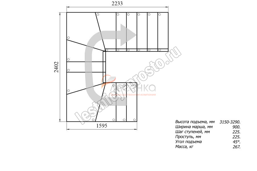 Модульная лестница Спринт 225 3150-3290, Белый, Сосна, Нержавеющая сталь