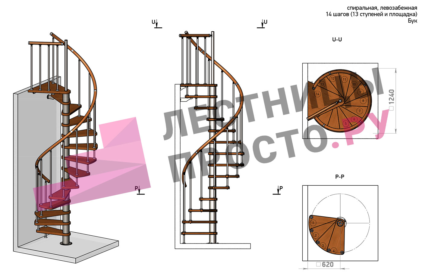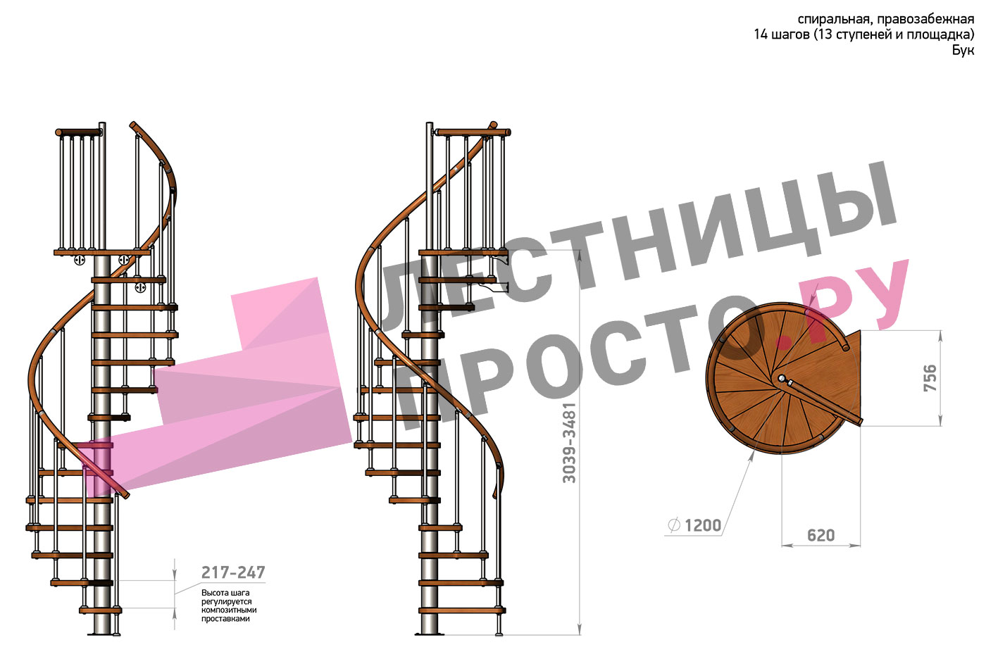 Винтовая лестница Prosto Spiral Black D120см, h303.9-348,1 см, бук